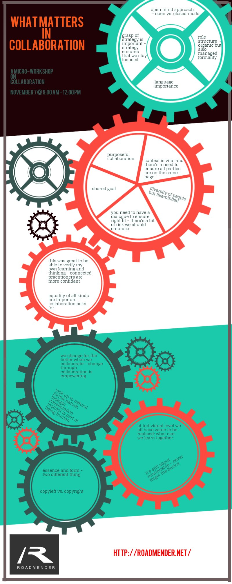 As opposed to a standard workshop approach, the ROADMENDER micro-workshop is an amalgam of a number of elements designed to saturate the environment with high volumes of information, concepts and ideas which are discussed with the notion of testing the relevancy of each concept against a given problem. The micro-workshop is facilitated with an intensity of purpose that focuses on lasting effects so that participants can reflect both consciously and with little awareness after the event. Brainstorming is blended with organic, in-depth discussions around ideas and concepts that challenge participants with no specific time dedication or limit to any one particular concept over another. Instead, competing ideas create a natural flow of discussion and logic that is intuitive to the participating group. With this in mind, the micro-workshop is designed to be conducted in one block of not more than 2.5 hours, and works best when participants glean ‘a-ha!’ moments throughout the session and find relevance of these insights with regard to their current work challenges. The infographic below captures some of these ‘a-ha’ moments that the participants shared at the end of the session.