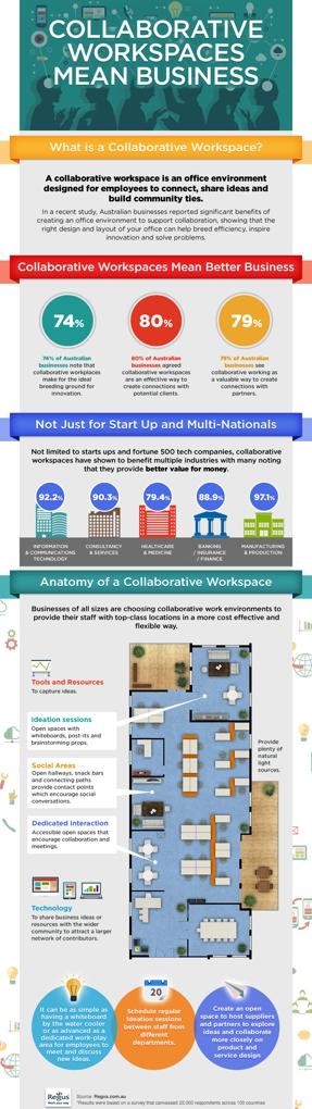 Australian entrepreneurs are great believers in collaboration, with 92 per cent saying collaborative working places offer start-ups excellent value for money in a recent survey. The research by global workplace provider Regus found that Australian businesses report improved efficiency and innovation, while co-operative problem solving also made the workplace a more fun and social experience. The survey had 22,000 respondents in 100 countries, including 727 respondents in Australia. Eight out of 10 Australian survey respondents said collaborative working places helped start-ups connect with potential clients, providers and suppliers, and partners…READ ON